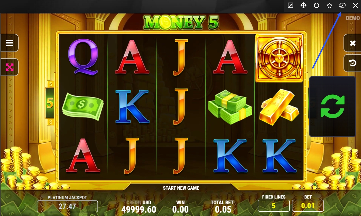 डेमो मोड एक शानदार तरीका है खेल से परिचित होने के लिए बिना वास्तविक पैसे लगाए। डेमो मोड सक्रिय करने के लिए बस स्क्रीन पर उपयुक्त बटन पर क्लिक करें। अगर बटन काम नहीं करता है, तो खेल के मेनू में किसी अन्य मोड पर स्विच करने का प्रयास करें।